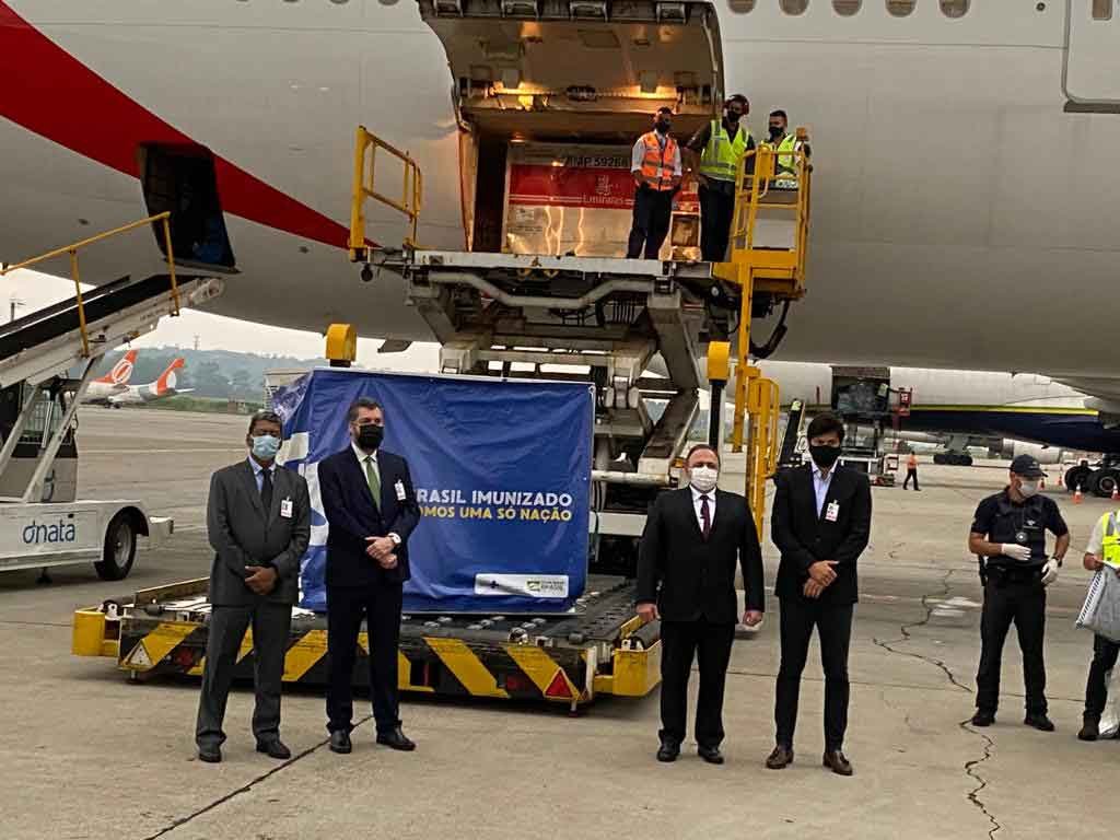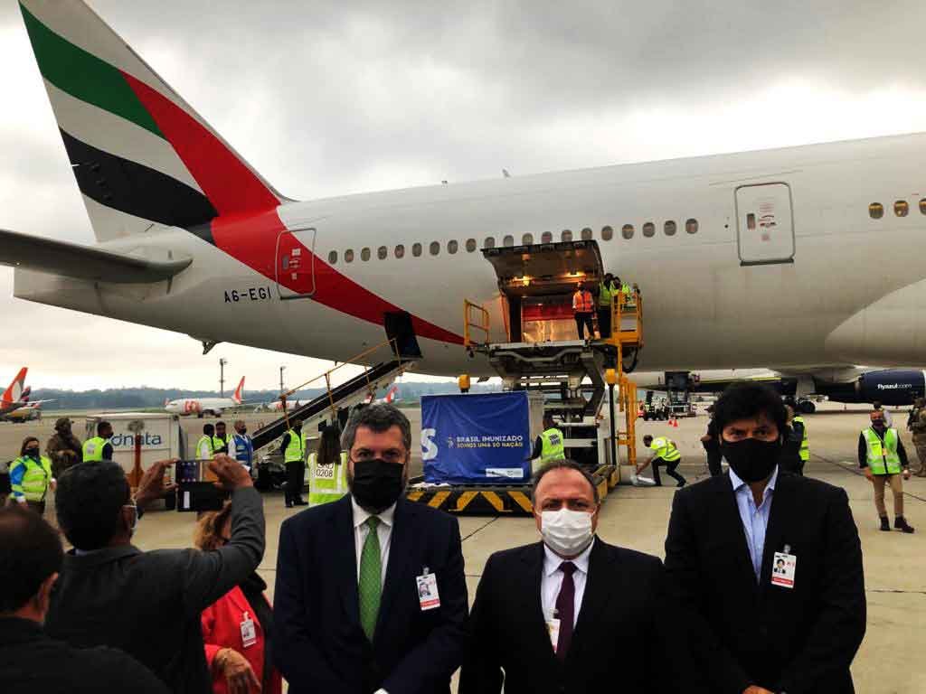 Os ministros Eduardo Pazuello (Saúde), Ernesto Araújo (Relações Exteriores) e Fábio Faria (Comunicações), além do embaixador da Índia no Brasil, Suresh Reddy, receberam o imunizante no aeroporto de Guarulhos