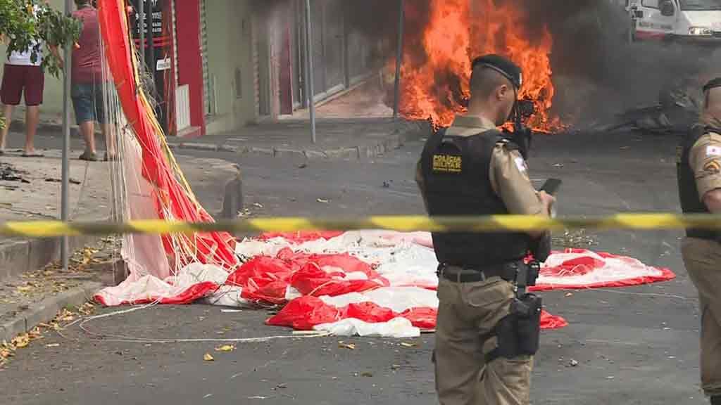 - A aeronave possui um paraquedas, que pode ser acionado quando há algum problema. O dispositivo podia ser visto caído próximo ao local do acidente nesta manhã.