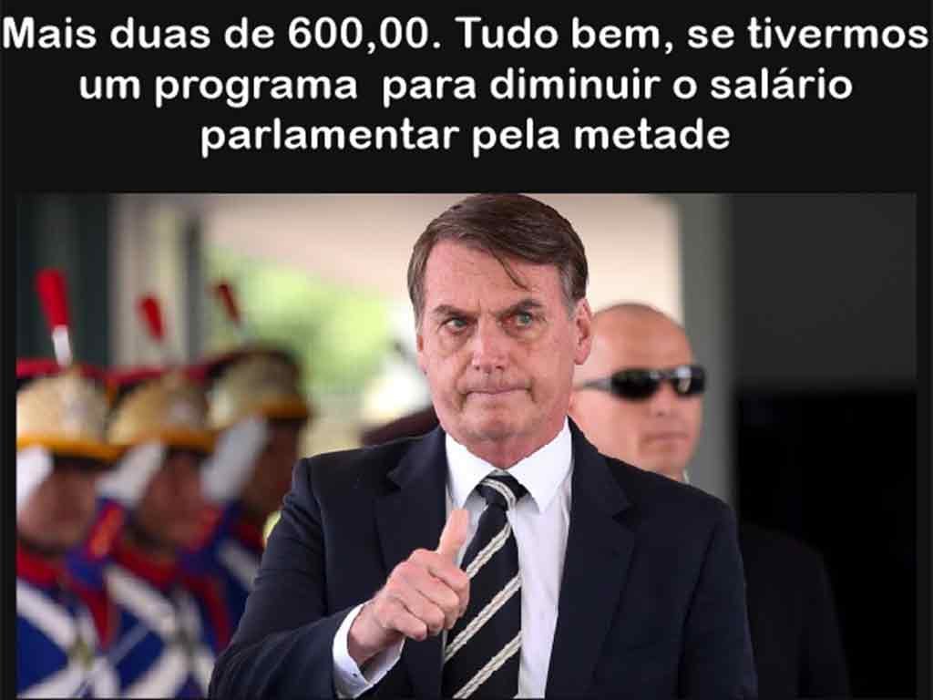 O Presidente sugeriu aos deputados e senadores que defendem o pagamento de mais duas parcelas de R$ 600 do auxílio emergencial, para cogitar a ideia de reduzir os seus próprios salários para garantir os recursos.