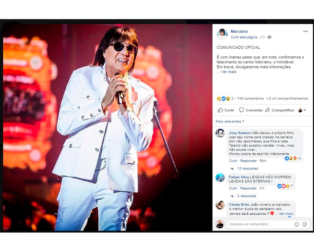 O cantor Fabiano Martins, filho de Marciano, lamentou a morte do pai. Nos últimos anos, os dois travaram uma batalha judicial após uma publicação no Facebook. Marciano processou Fabiano por danos morais e pedia indenização de R$ 20 mil.