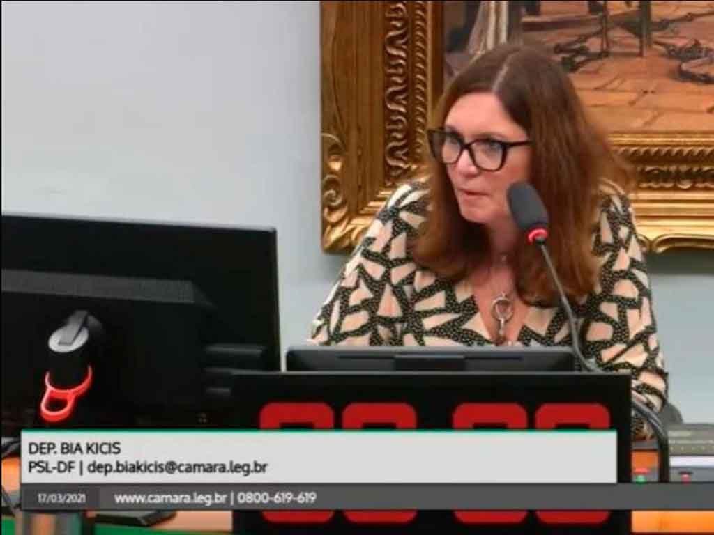Presidente do colegiado, a deputada bolsonarista Bia Kicis (PSL-DF) conduziu parte dos debates sem máscara