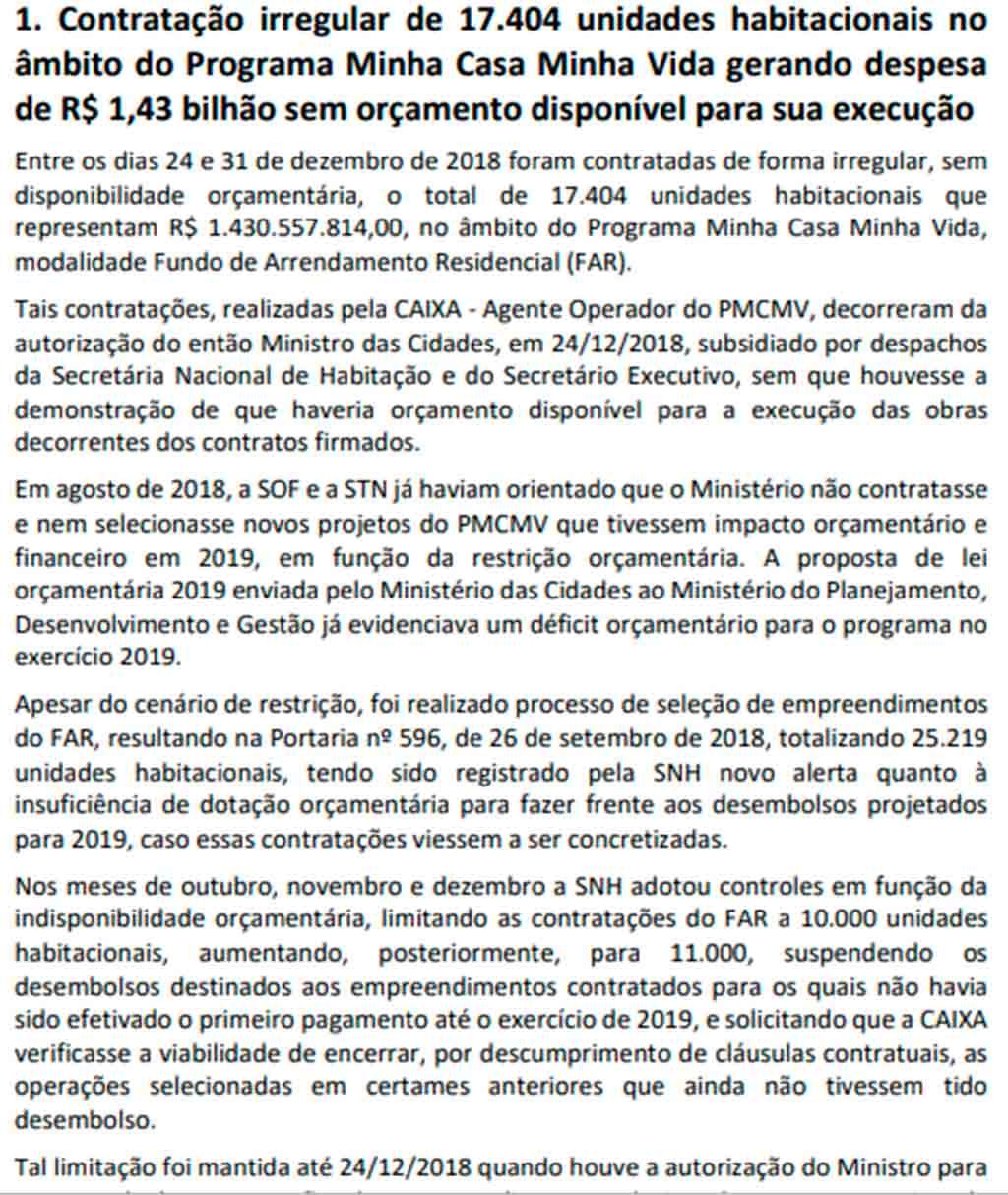 “A orientação para que as contratações fossem realizadas foi sustentada pelo Ministro das Cidades, informando à CAIXA que caberia ao Ministério, na condição de gestor da aplicação dos recursos vinculados ao PMCMV, adotar medidas necessárias à cobertura orçamentária”, informam os auditores.