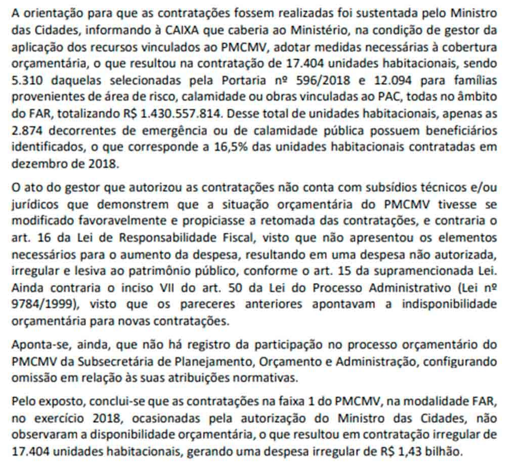 No relatório, consta que o “ato do gestor que autorizou as contratações não conta com subsídios técnicos e/ou jurídicos que demonstrem que a situação orçamentária do PMCMV tivesse se modificado favoravelmente e propiciasse a retomada das contratações, e contraria o art. 16 da Lei de Responsabilidade Fiscal, visto que não apresentou os elementos necessários para o aumento da despesa, resultando em uma despesa não autorizada, irregular e lesiva ao patrimônio público, conforme o art. 15 da supramencionada Lei”.