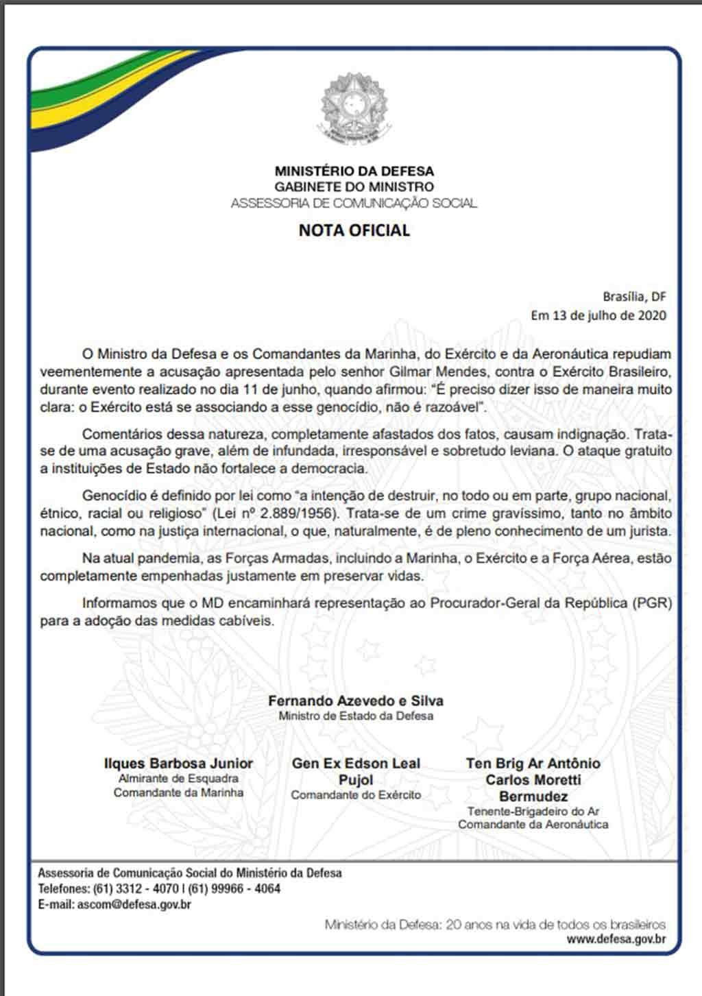 BRASÍLIA – O ministro da Defesa, general Fernando Azevedo, anunciou nesta segunda-feira, 13, que vai encaminhar uma representação à Procuradoria-Geral da República contra o ministro do Supremo Tribunal Federal (STF) Gilmar Mendes. O motivo é a declaração do magistrado, no sábado, de que o Exército está se associando a um “genocídio”, em referência à crise sanitária instalada no País em meio à pandemia de covid-19, agravada pela falta de um titular no Ministério da Saúde.