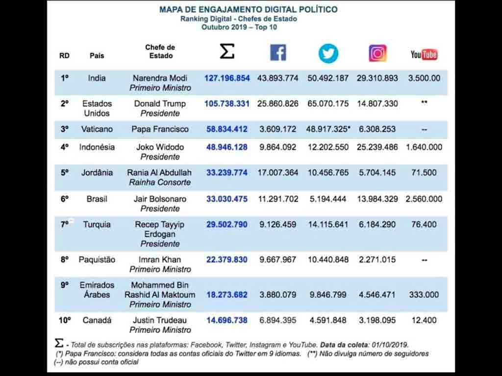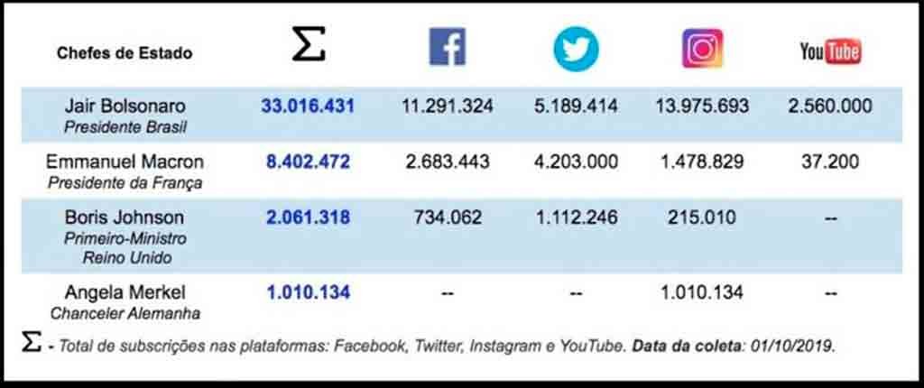 É interessante comparar o número seguidores do Presidente Bolsonaro com outras autoridades, como Emmanuel Macron, Angela Merkel e Boris Johnson: estes três líderes não possuem tanta expressividade nas redes sociais pesquisadas, e não entram no Top 10 dos Chefes de Estado do Mundo, como mostra o quadro comparativo abaixo.