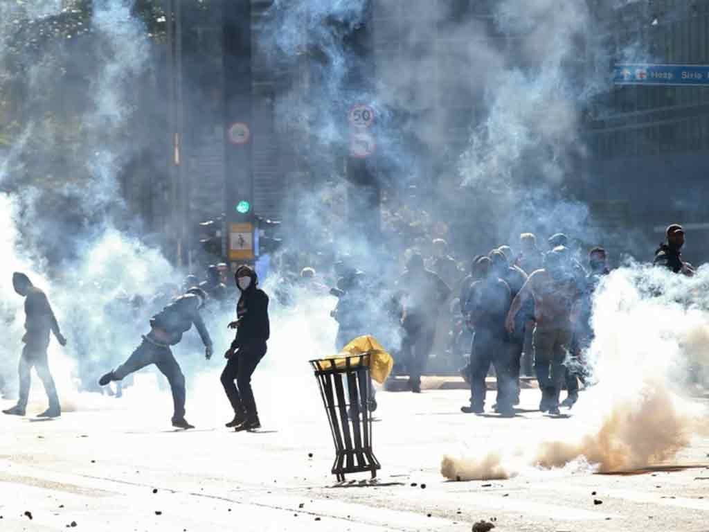 Manifestantes revidavam com pedras e rojões e se recusavam a deixar o local — um artefato explosivo caseiro em direção à PM. Os grupos faziam barricadas com grades e fogo. Bancas de jornal e lojas foram depredadas pelo caminho.