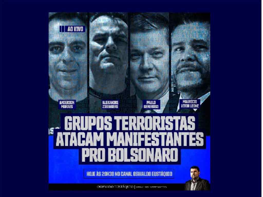 Neste domingo o Jornalista Oswaldo Eustaquio recebe em sua live de domingo Anderson Moraes, Alexandre Zibenberg, Paulo Generoso e Mauricio Vitor Leone comentam :"Grupos Terroristas atacam manifestantes pró Bolsonaro[/caption]