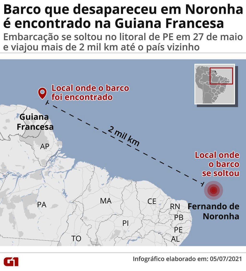 Barco que desapareceu em Fernando de Noronha é encontrado na Guiana Francesa — Foto: Arte/G1 [/caption]