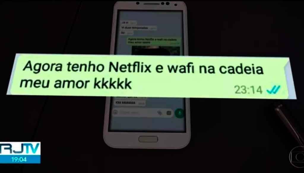 Em conversa por mensagem exibida pelo RJ2, um preso mostra uma foto de um roteador e comemora ter conseguido Wi-Fi. "Agora tenho Netflix e Wi-Fi na cadeia, meu amor!", comemora o preso.[/caption]