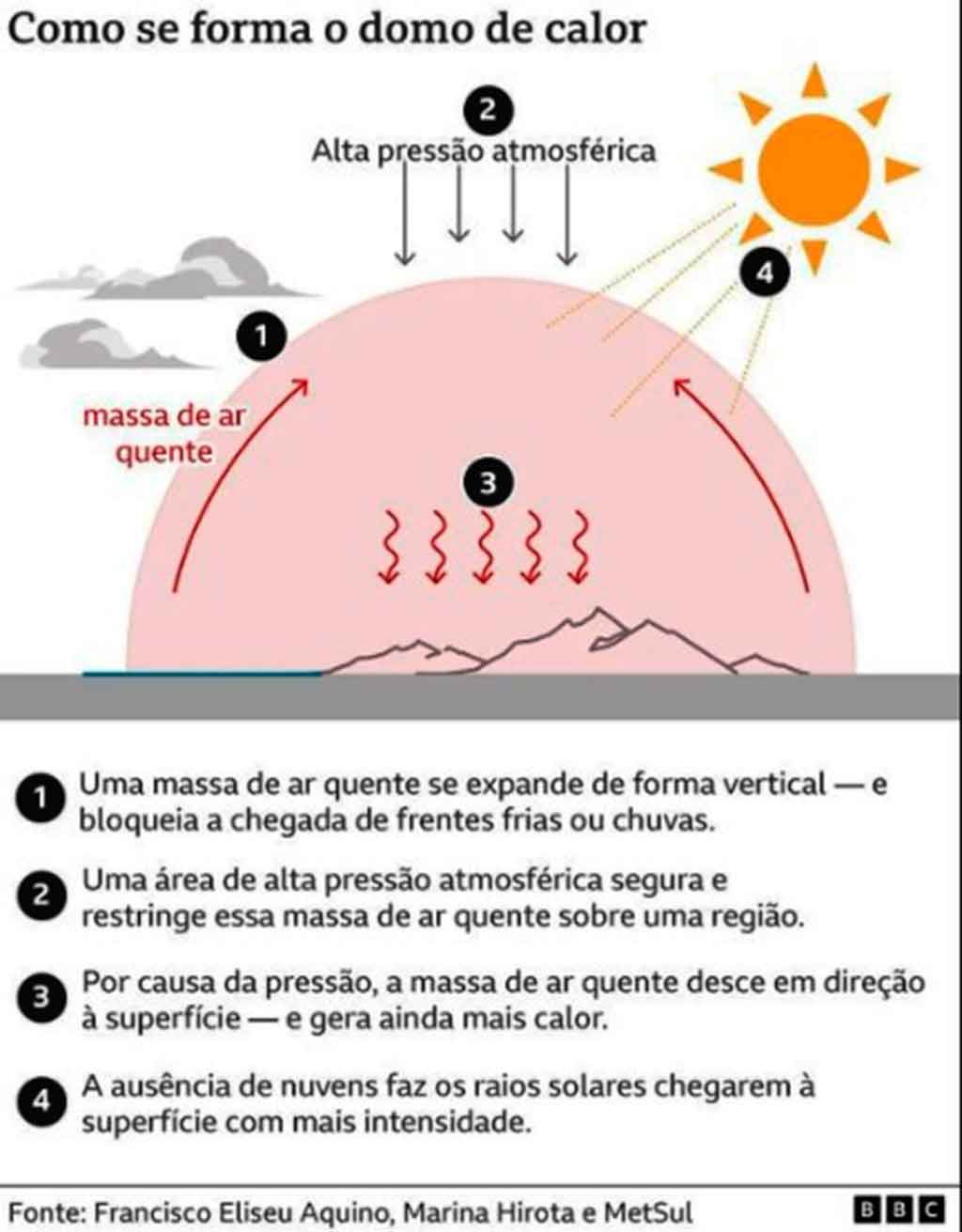 Essa região de alta pressão atmosférica funciona praticamente como a tampa de uma panela. Ele retém o calor dentro de um espaço definido — no caso do domo atual, é uma área grande e que abrange vários estados brasileiros.