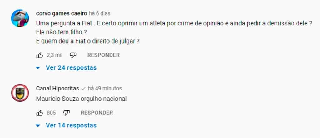– Uma pergunta à Fiat: é certo oprimir um atleta por crime de opinião e ainda pedir a demissão dele? – comentou um internauta.