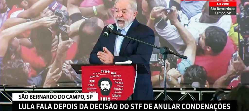 desta quarta-feira (10). Ele fez um longo pronunciamento depois que o STF anulou todas as suas