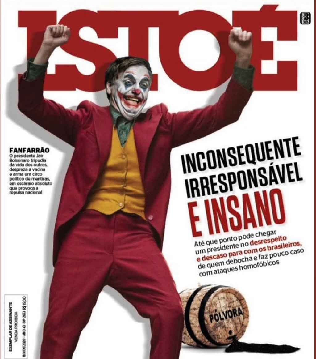 Na edição desta sexta-feira (13), a revista IstoÉ trouxe o presidente Jair Bolsonaro vestido como o personagem Coringa, em uma alusão a um “palhaço destruidor”, para criticar o chefe do Executivo.