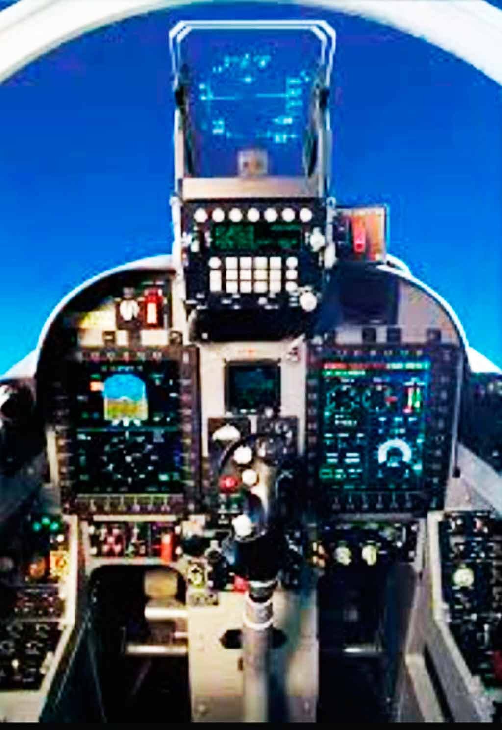 com telas multifuncionais e coloridas compatíveis com a operação de óculos de visão noturna; head-up display; datalink; comunicação criptografada entre outras qualidades.