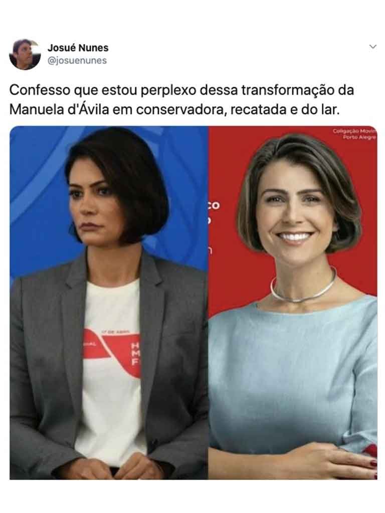 Isto porque a candidata do PCdoB aparece visivelmente diferente do que vinha se apresentando: agora com roupas em tom sóbrio, sem o vermelho característico, e também com um corte de cabelo curto estilo chanel, que chegou a ser comparado ao da primeira-dama Michelle Bolsonaro.