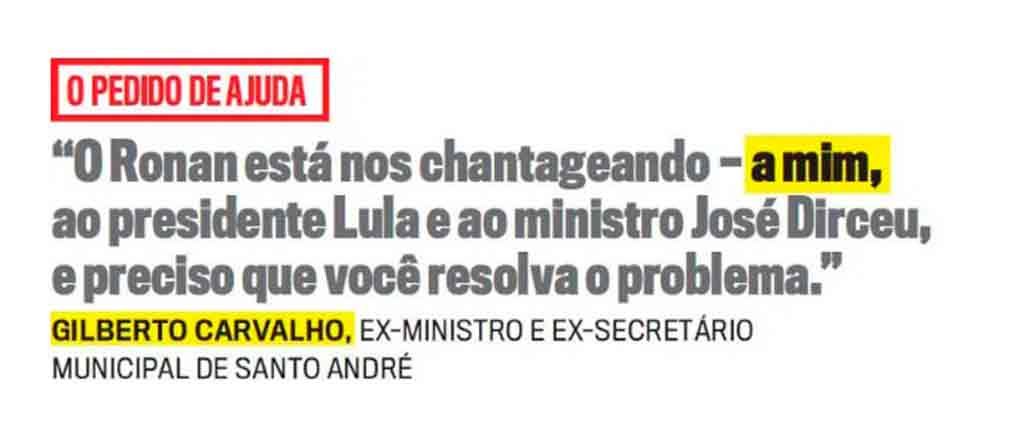 “Marcos, nós estamos com um problema. O Ronan está nos chantageando, a mim, ao presidente Lula e ao ministro José Dirceu, e preciso que você resolva”, teria dito Carvalho. “Ele precisa de um recurso, e eu quero que você procure o Silvio Pereira (ex-secretário-geral do PT)”, acrescentou.