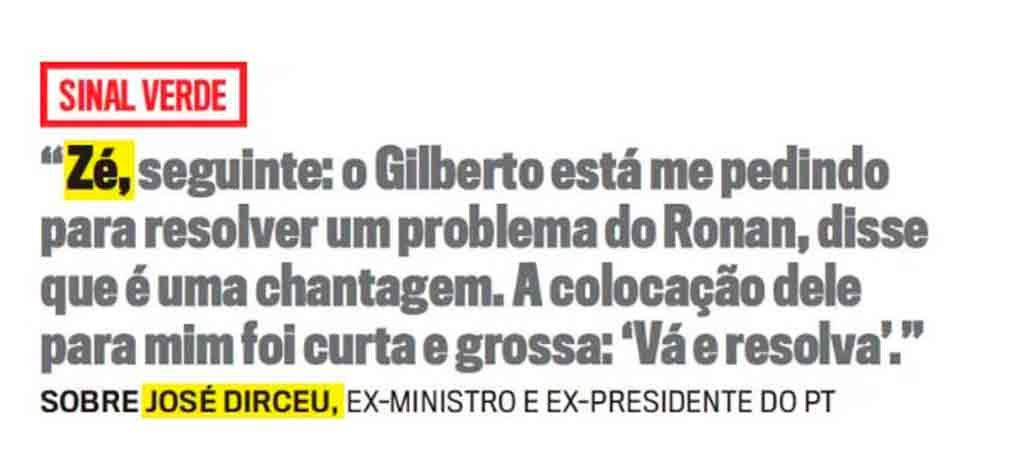 “Zé, seguinte: o Gilberto está me pedindo para eu procurar o Silvio Pereira para resolver um problema do Ronan Maria Pinto. Disse que é uma chantagem”, narra Valério no depoimento. A resposta do então chefe da Casa Civil teria sido curta e grossa: “Vá e resolva”.