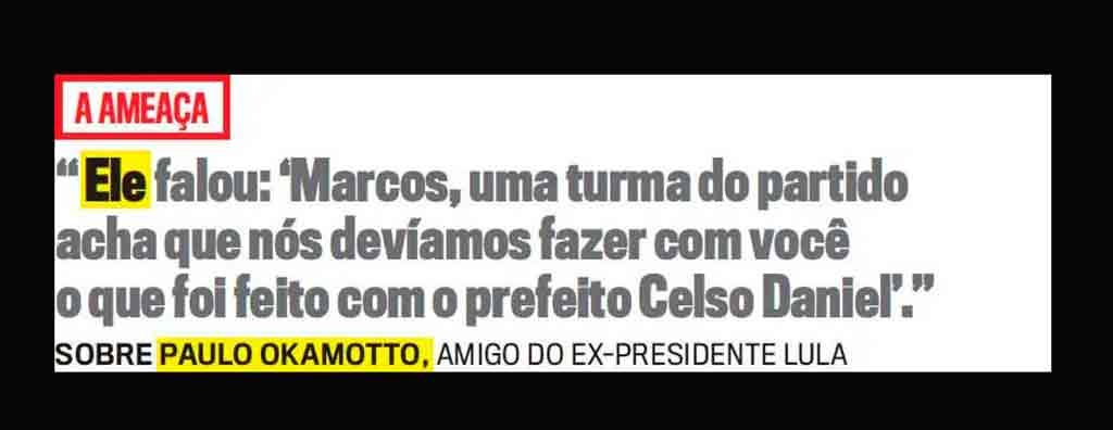“Marcos, uma turma do partido acha que nós devíamos fazer com você o que foi feito com o prefeito Celso Daniel. Mas eu não, eu acho que nós devemos manter esse diálogo com você. Então, tenha juízo”, teria lhe dito Okamotto.