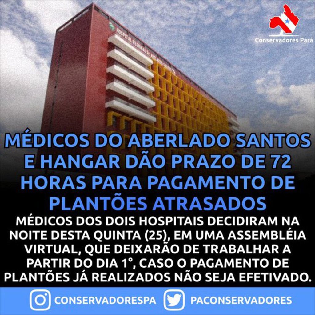 “Se não houver pagamento, a partir de quarta-feira, 1º, não haverá médicos para atender no Hangar e no Abelardo Santos. Isso é perfeitamente legal e vamos informar o Ministério Público, CRM e o próprio estado da decisão. É um abuso o que estão fazendo com os médicos no Pará”,