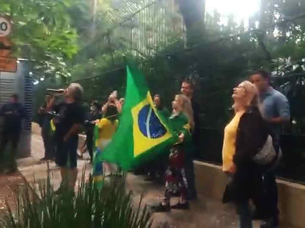 [caption id="attachment_80818" align="alignnone" width="1024"] Cerca de 15 pessoas se reuniram com bandeiras do Brasil, cartazes e uma caixa de som e gritaram ofensas contra Alexandre de Moraes e palavras de ordem contra o Supremo em frente ao prédio do ministro.[/caption]