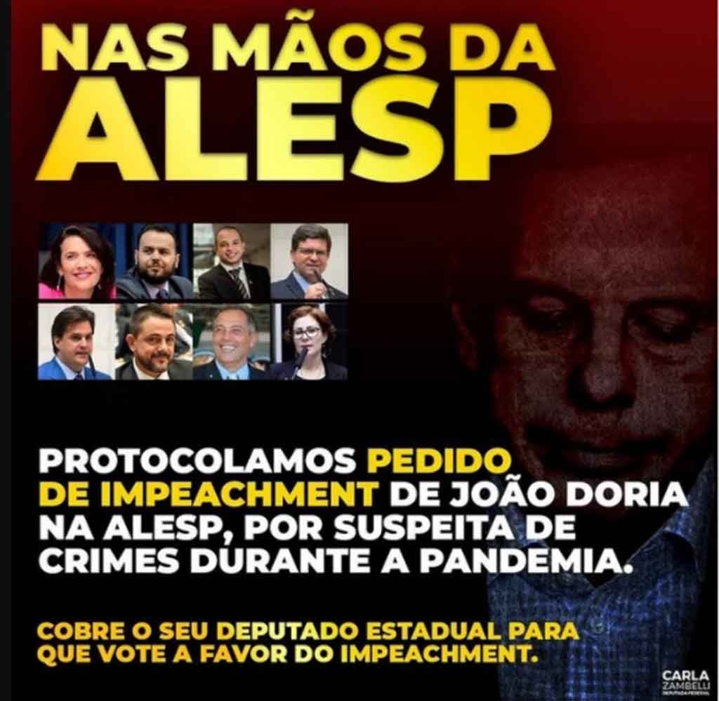 ” Protocolamos o pedido de impeachment, por suspeitas de desvios na compra de respiradores e luvas cirúrgicas, e com base no parecer do Ministério Público de Contas de São Paulo, pela reprovação das contas da gestão. Se condenado o governador poderá além de perder o mandato, tornar-se inabilitado para o exercício de qualquer função pública por 8 anos. Conversem com o Presidente da ALESP, Cauê Macris, para que ele coloque o impeachment em votação – escreveu.”