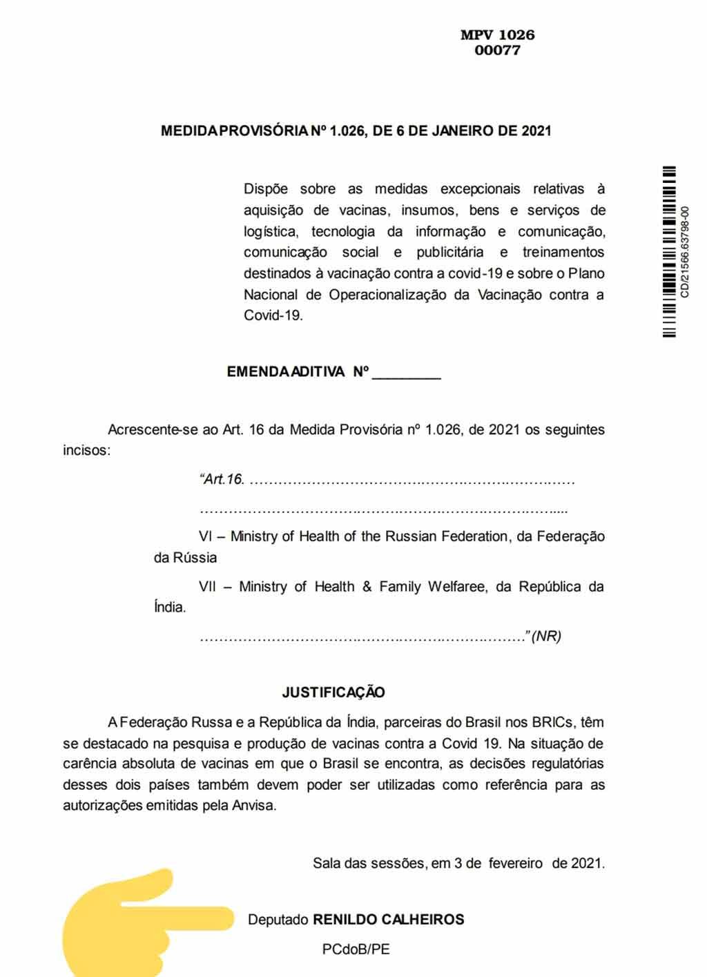 apresentou na Câmara para favorecer a vacina indiana (Covaxin). A MP