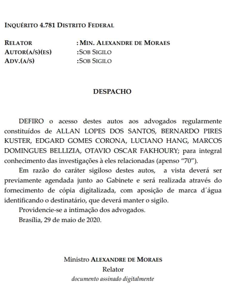 Advogados de Abraham Weintraub, Carla Zambelli, Reynaldo Bianchi Júnior, Allan Lopes dos Santos, Bernardo Pires Kuster, Edgard Gomes Corona, Luciano Hang, Marcos Domingues Bellizia e Otavio Oscar Fakhoury terão acesso às investigações relacionadas a seus clientes.