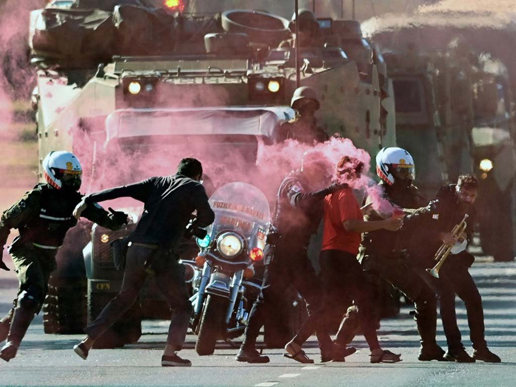 Militares prendem manifestantes que tentavam bloquear desfile de veículos militares em frente ao Palácio do Planalto, em Brasília, em 10 de agosto de 2021 — Foto: Evaristo Sa/AFP[/caption]