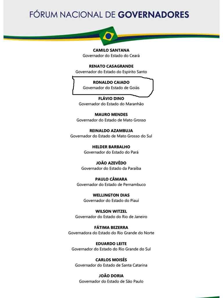 “O Fórum Nacional de Governadores manifesta apoio ao Presidente do Senado Federal, Davi Alcolumbre, e ao Presidente da Câmara dos Deputados, Rodrigo Maia, diante das declarações do Presidente da República, Jair Bolsonaro, sobre a postura dos dois líderes do parlamento brasileiro, afrontando princípios democráticos que fundamentam nossa nação.