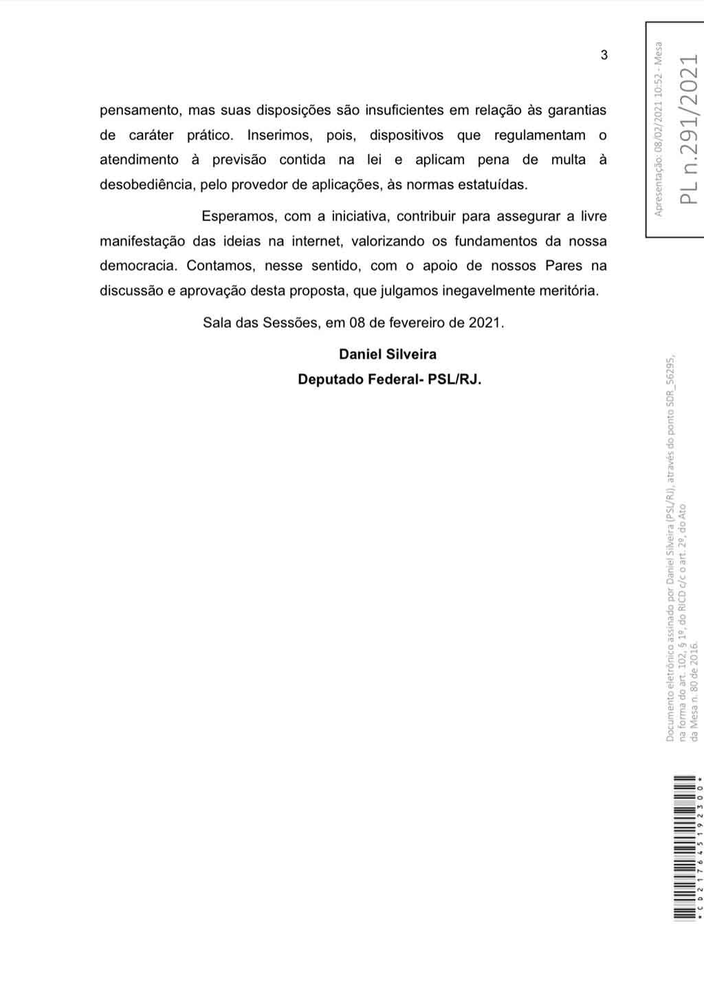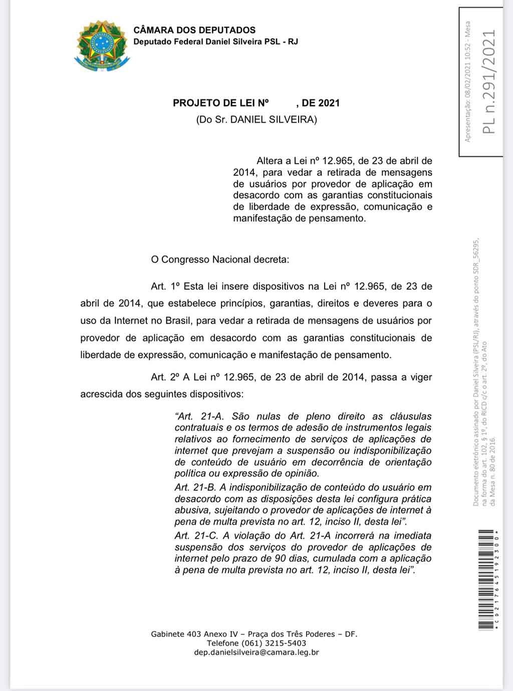 O deputado federal, Daniel Silveira, protocolou junto a 7 parlamentares, o Projeto de Lei 291/2021 que estimula uma multa as empresas de Big Techs das redes sociais e suspende o direito de operação no Brasil por 90 dias.