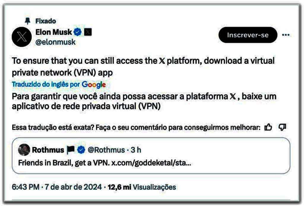 Em seu perfil no X, Musk fixou um tweet em que recomenda que brasileiros usem VPN: “Para garantir que você ainda possa acessar a plataforma X, baixe um aplicativo de rede privada virtual (VPN)”.