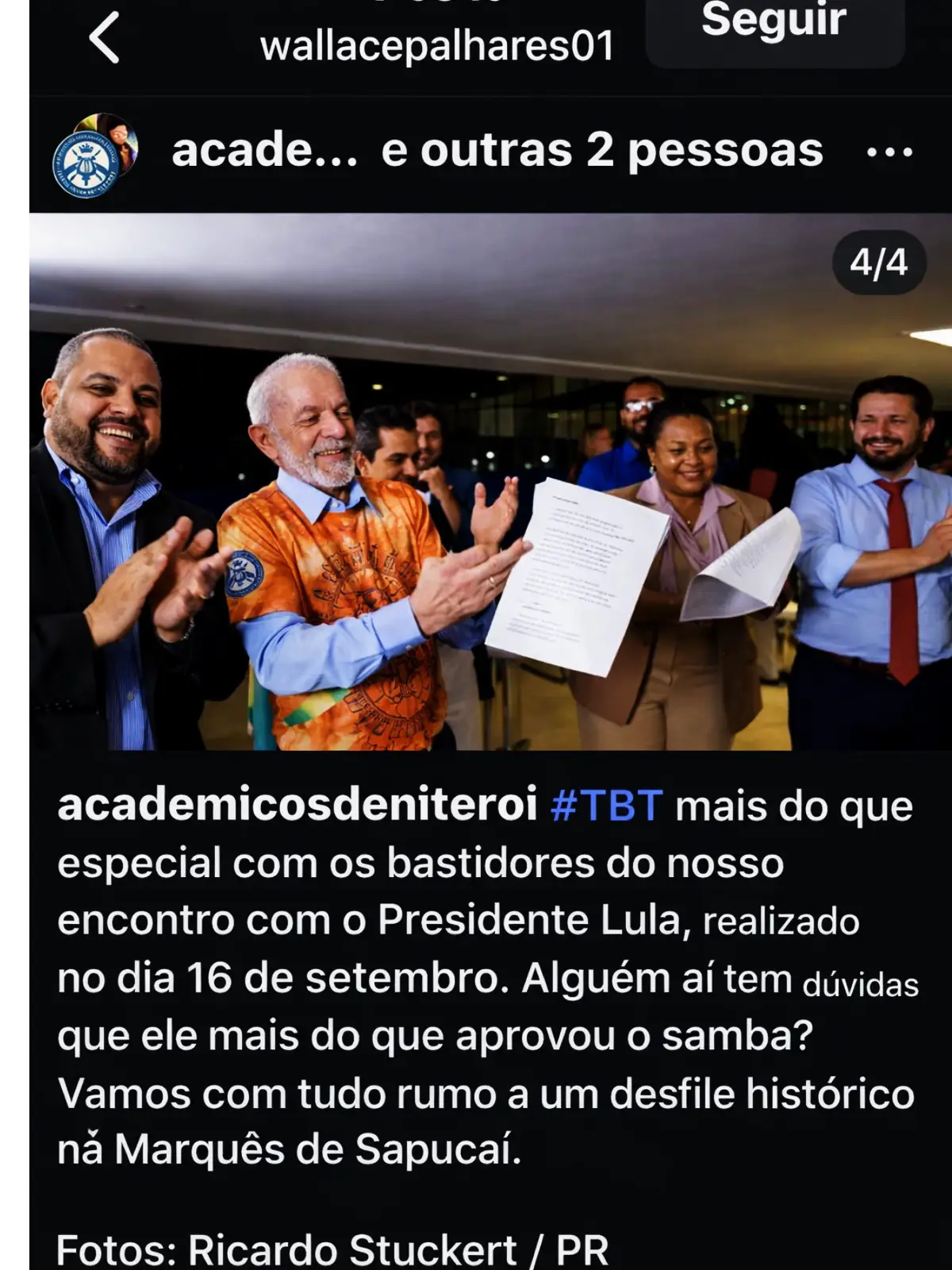 1. 16 de Setembro: Fotos oficiais (Ricardo Stuckert) registram o Presidente recebendo e aprovando o samba no Palácio do Planalto.