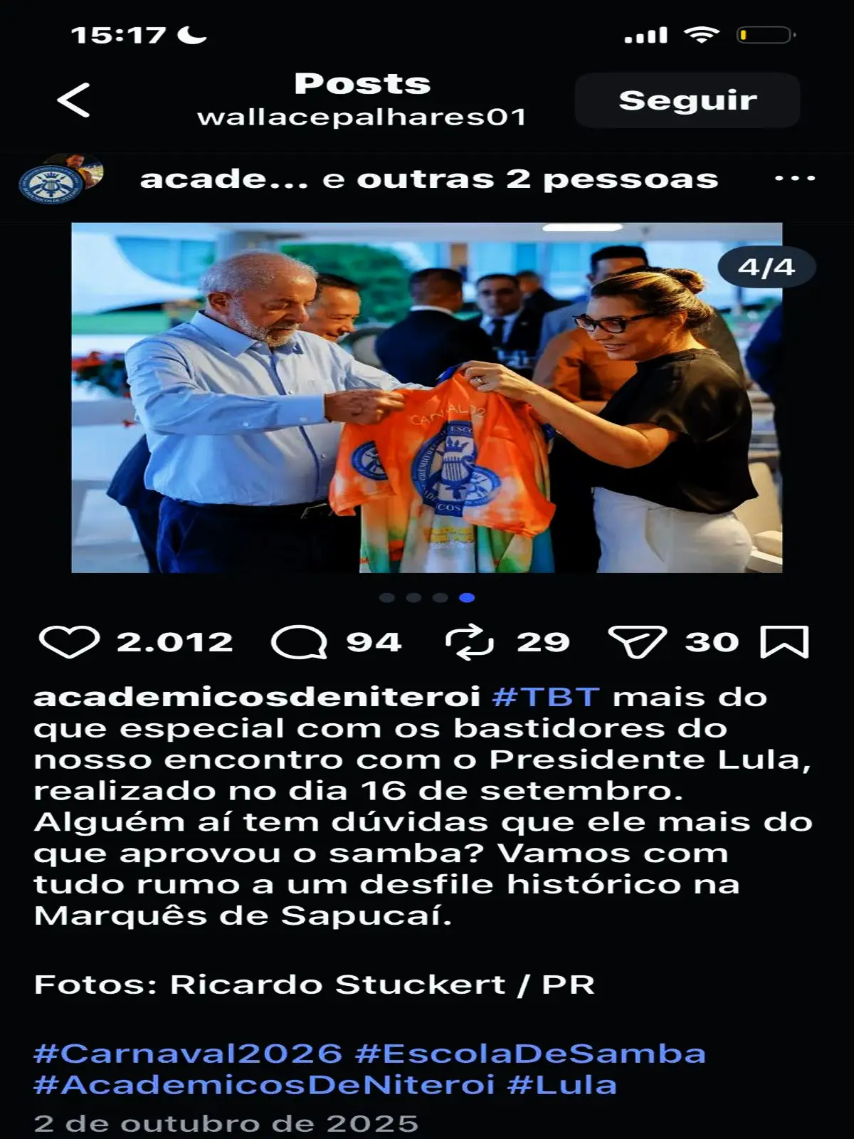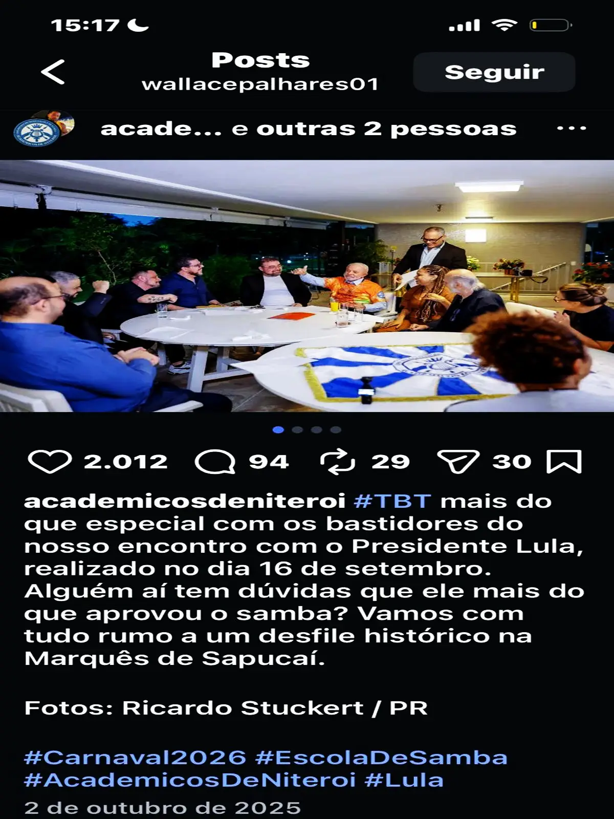 Post de Wallace Palhares sobre a visita e a apresentação do projeto de carnaval 2026