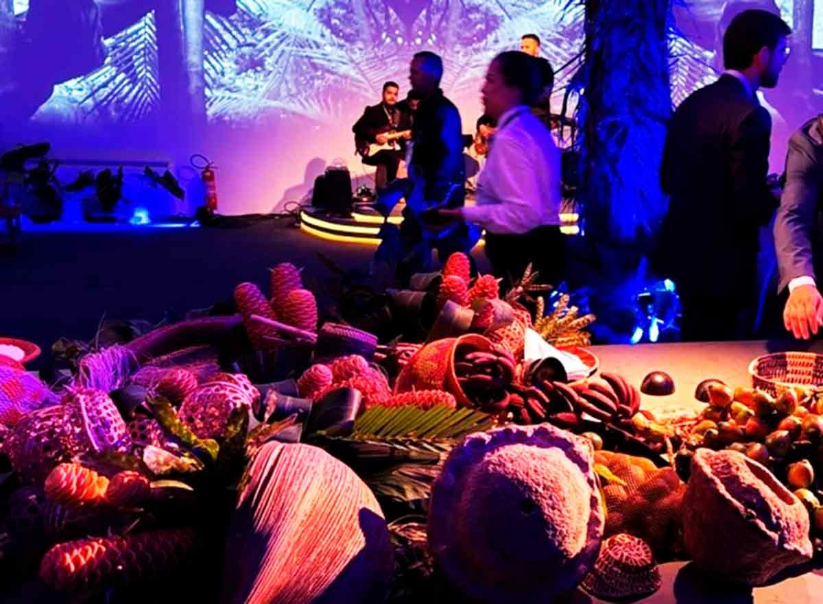 Nos telões instalados nos quatro cantos do salão, imagens de ribeirinhos, da Amazônia e da cultura paraense se alternavam ao som da inconfundível lambada paraense.