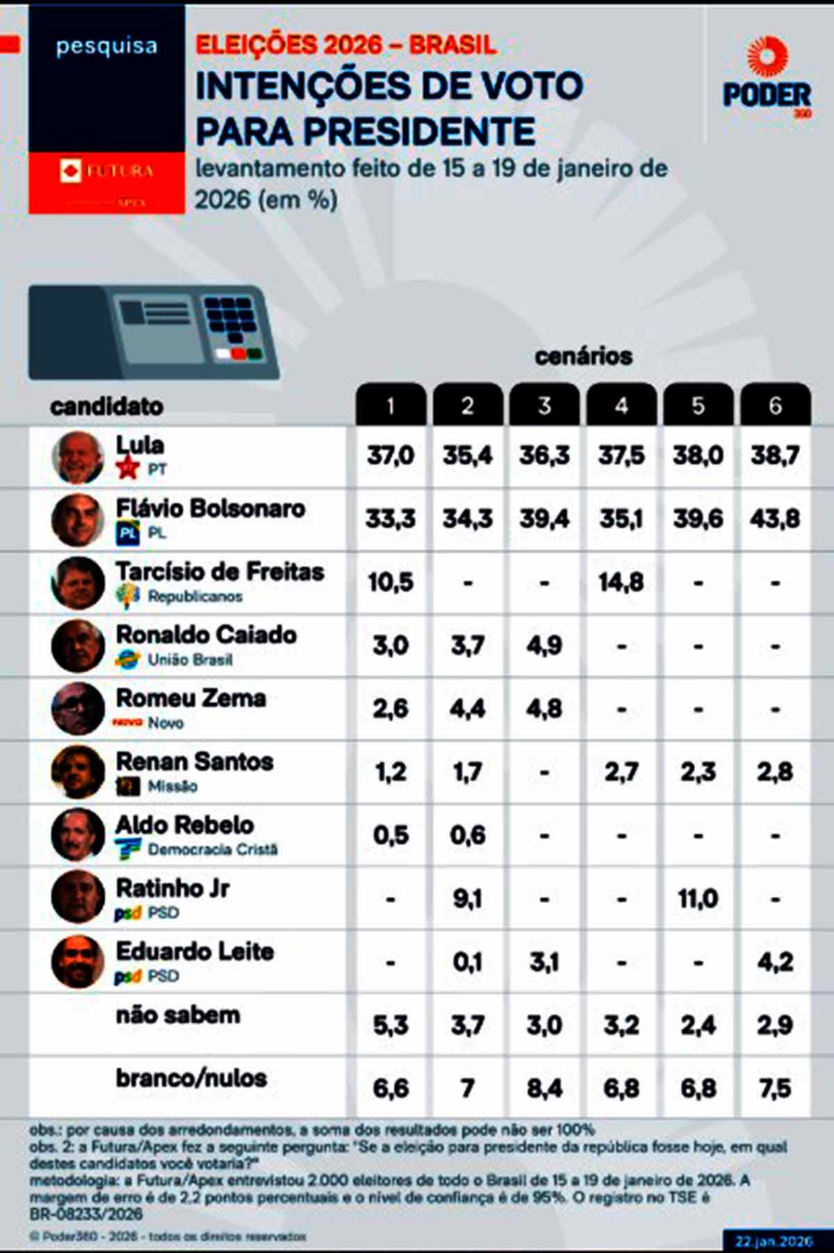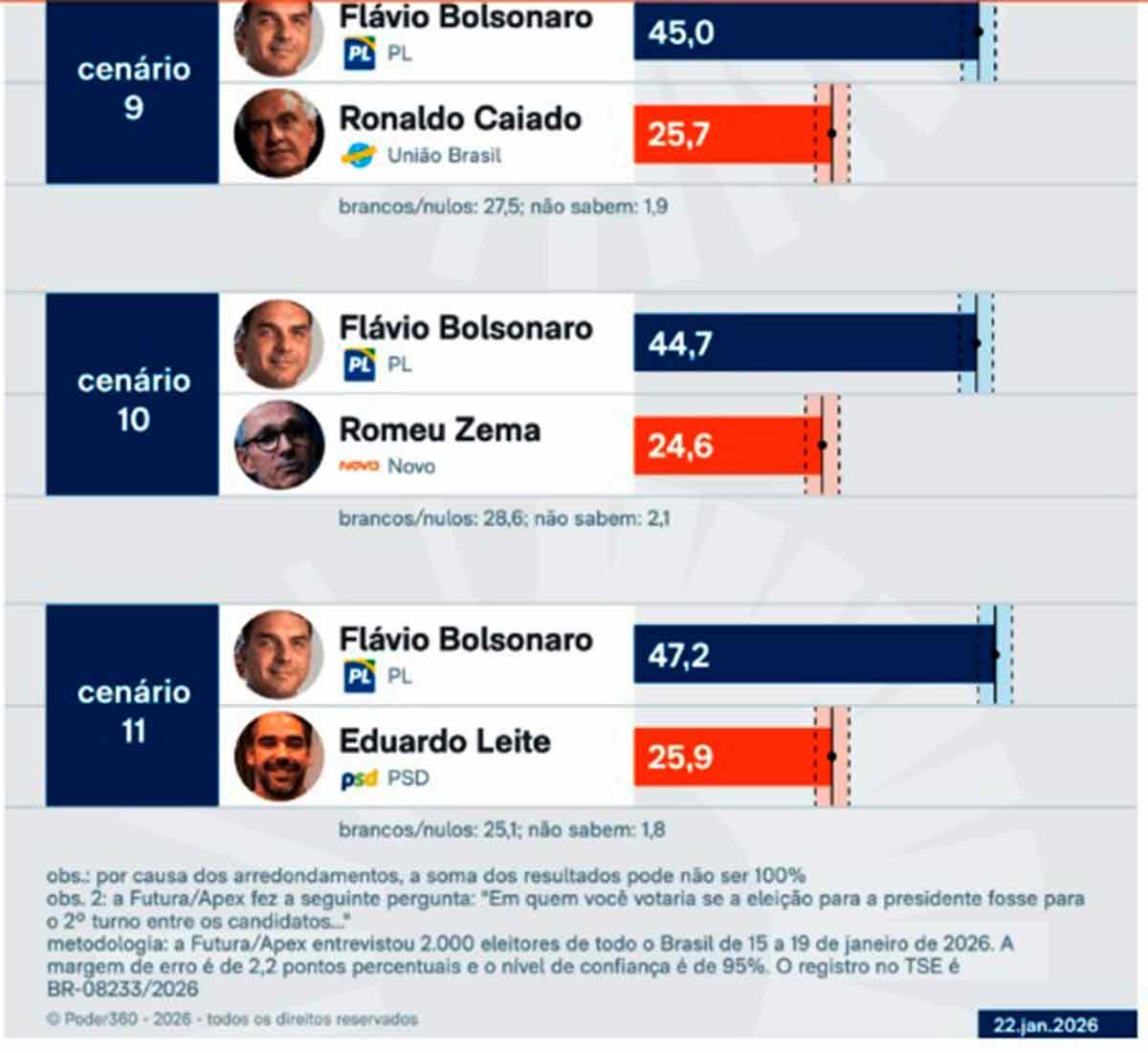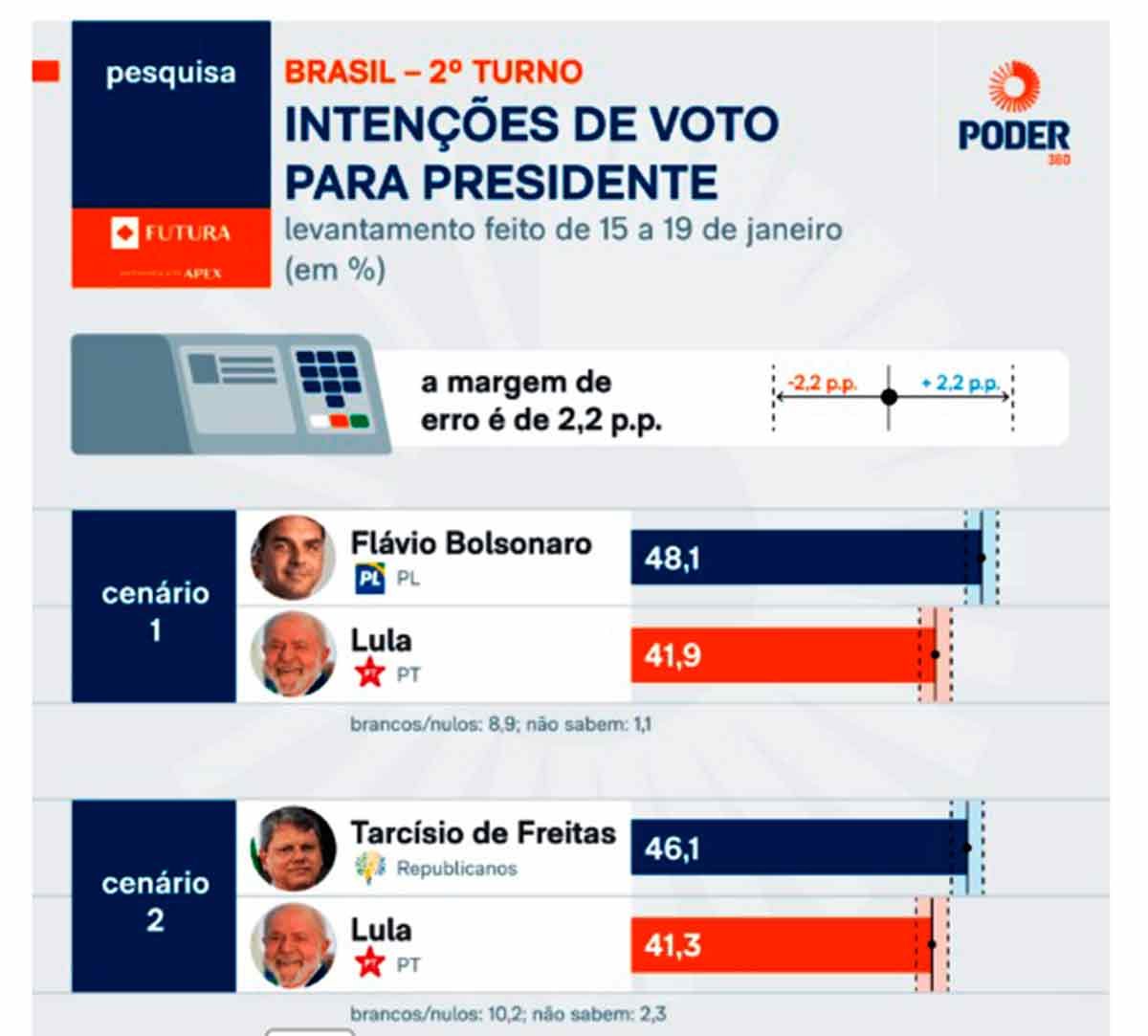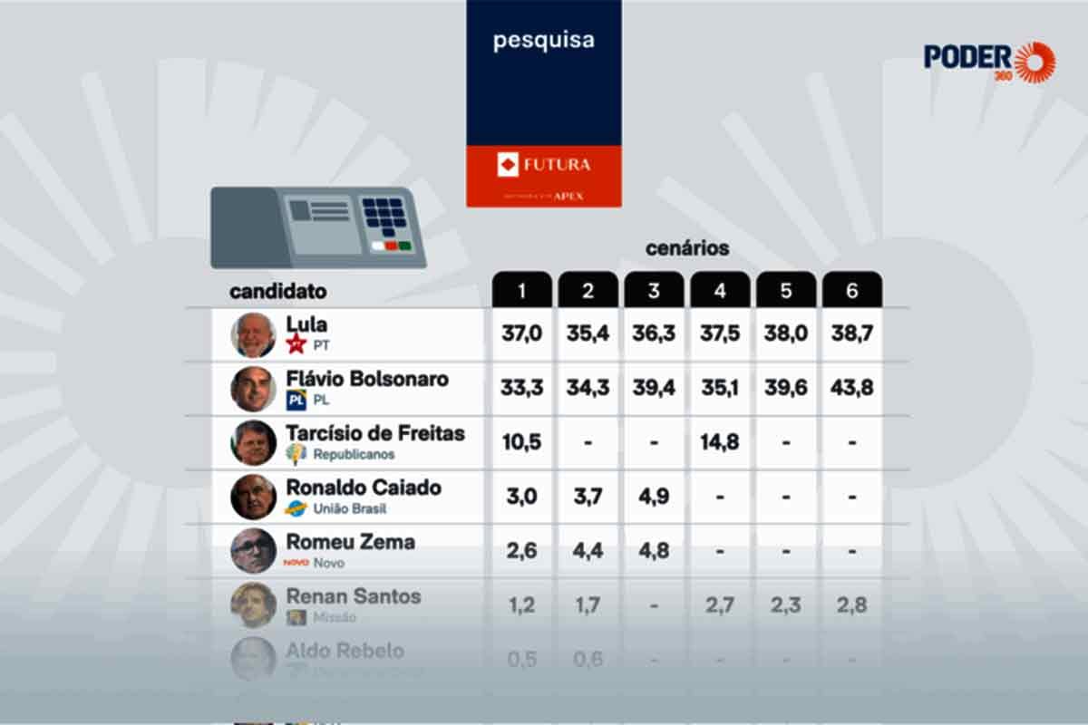 Segundo pesquisa Futura/Apex, divulgada nesta 5ª feira (22.jan.2026), o senador Flávio Bolsonaro (PL-RJ) venceria o presidente Luiz Inácio Lula da Silva (PT) em um possível 2º turno.