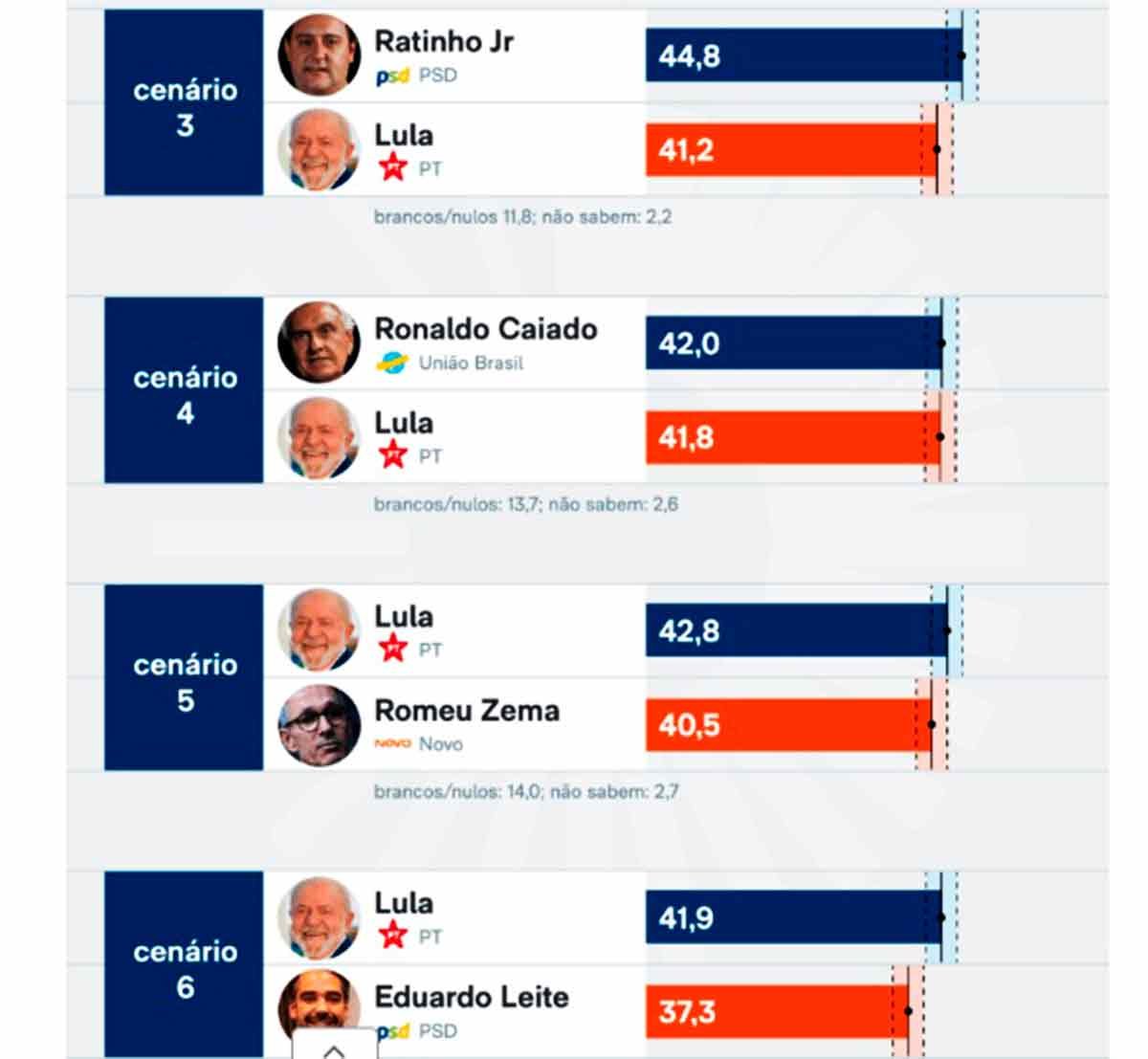Apesar disso, todos os casos são considerados empates técnicos graças à margem de erro de 2,2 pontos percentuais.