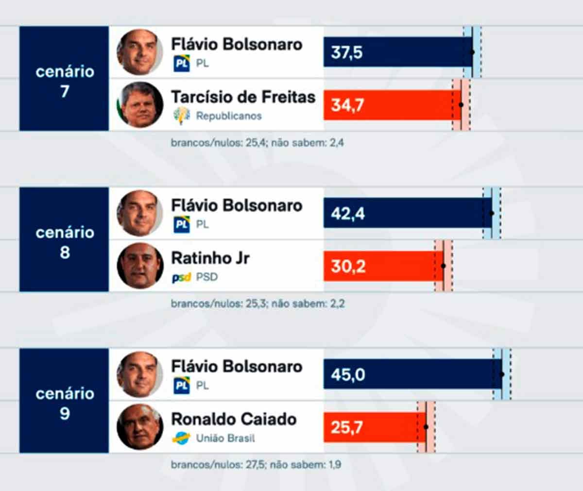 Enquanto Flávio tem 48,1% das intenções de voto, o chefe do Executivo tem 41,9% –uma diferença de 6,2 pontos percentuais.
