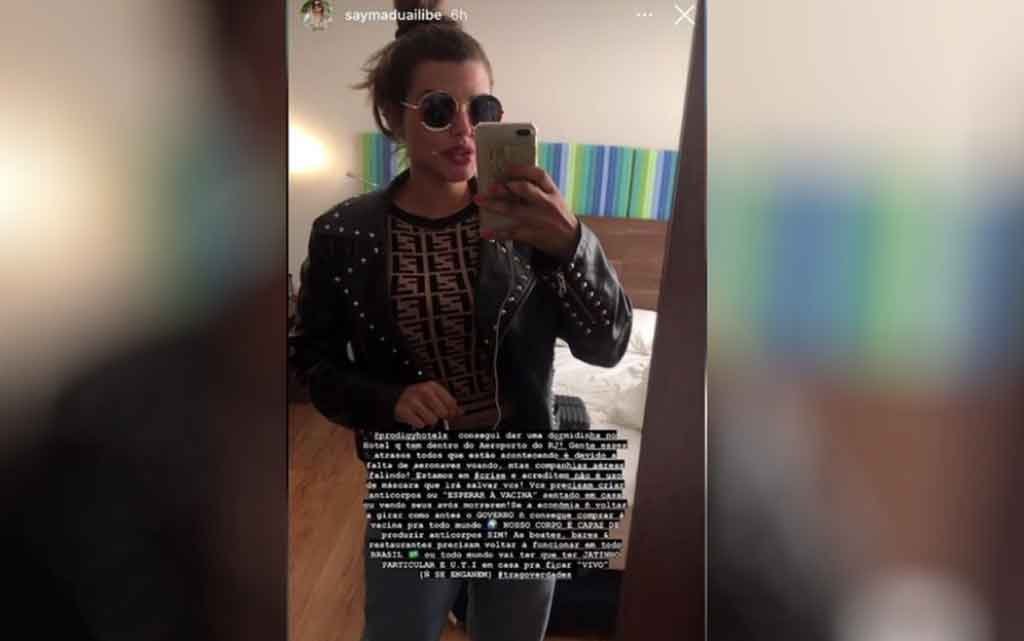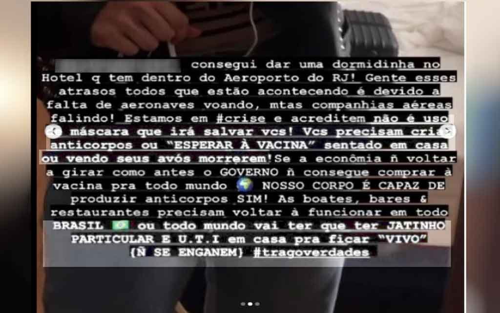 A postagem foi feita após um voo atrasar e a blogueira ter de dormir em um hotel de um aeroporto no Rio de Janeiro. Na publicação, ela também pedia a volta das boates. A influenciadora digital tem quase 300 mil seguidores e seus relatos contradizem as regras de combate e prevenção ao coronavírus, conforme especialistas. No post, ela ainda escreveu “#TragoVerdades”.