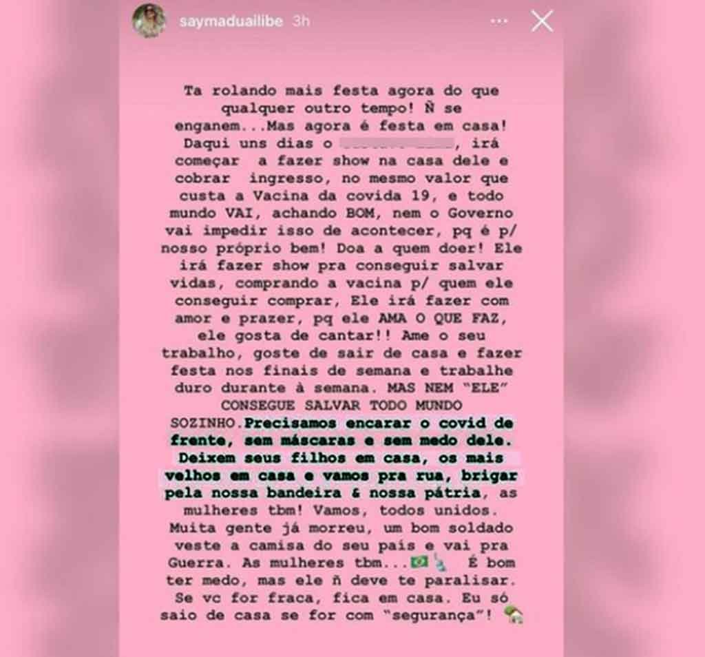 Em outro post, a blogueira escreveu para seus quase 300 mil seguidores que todos precisam encarar a doença de frente, sem máscaras e que precisam ir para as ruas. A Covid-19 havia tirado a vida de 212.893 brasileiros, até as 20h de quarta-feira (20).