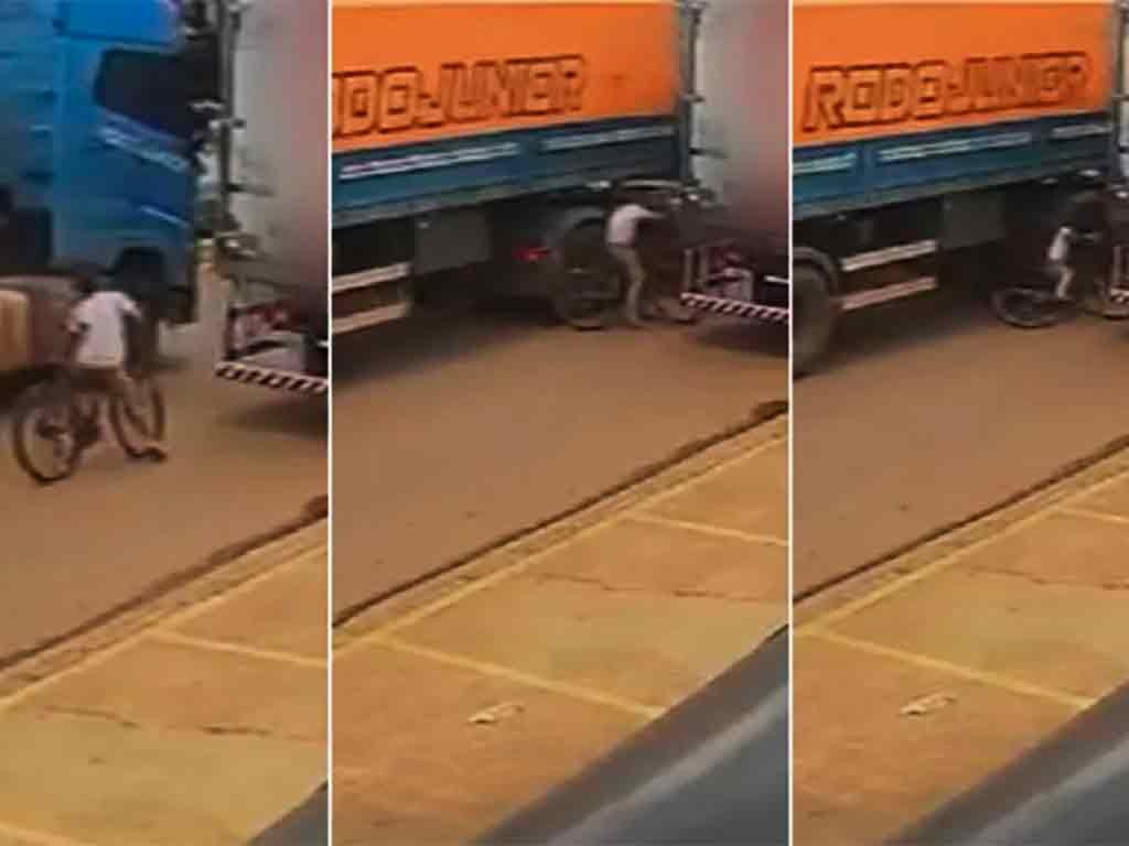 e por pouco não foi parar debaixo de um caminhão em Itaberaí, na região noroeste de Goiás. Vídeos de câmera de segurança mostraram que o rapaz estava pedalando quando tentou passar entre dois caminhões e caiu