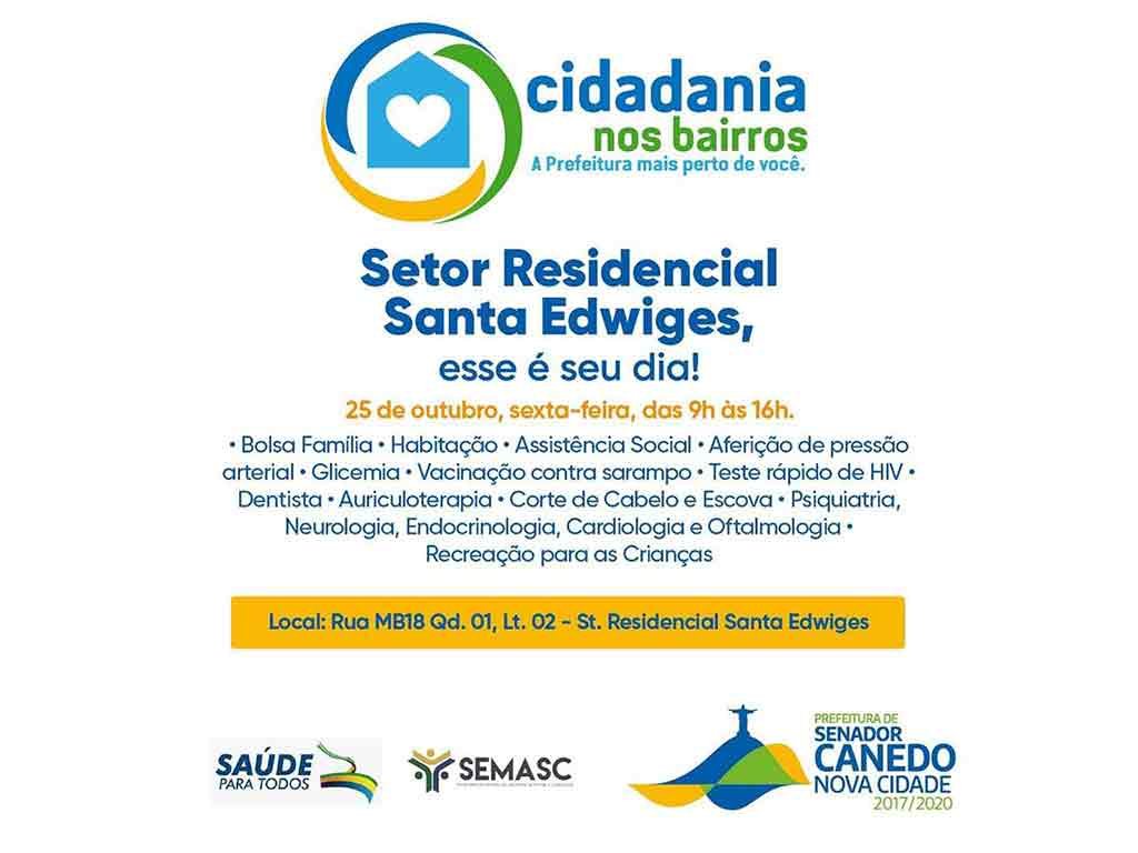 A Prefeitura de Senador Canedo por meio da Secretaria Municipal de Assistência Social e Cidadania, em parceria com a Secretaria Municipal de Saúde, convida todos os moradores do Residencial Santa Edwiges e região, para participarem do projeto Cidadania nos Bairros, na próxima sexta-feira, 25 de outubro. Serão oferecidos diversos serviços e atendimentos a população, a partir das 9h, na Rua MB- 18, Residencial Santa Edwiges.