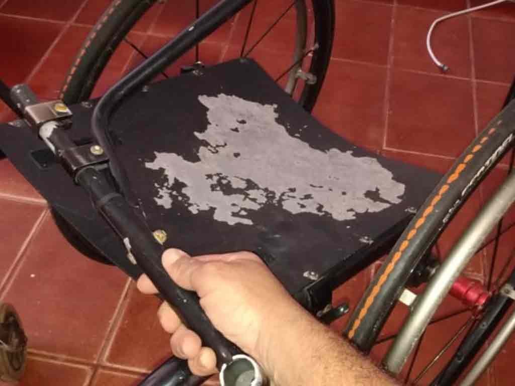 Estudante mostra cadeira de rodas que quebrou após ele voltar de supermercado em Goiânia — Foto: Diogo Meneses/Arquivo pessoal[/caption]