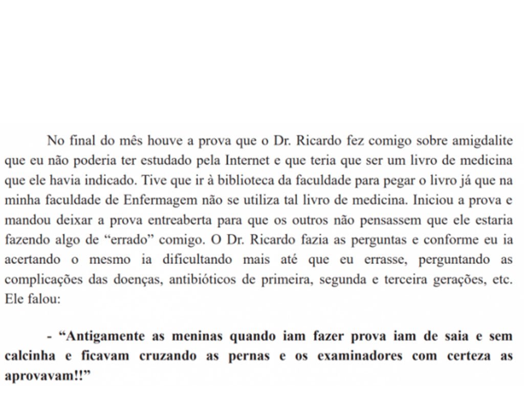 “Quando eu ficava irritada com as insinuações sexuais, (ele) dizia que adoraria me acalmar na cama”, disse. Ela relata ter ouvido suposta barganha de gratificações. “Doutora, mas eu posso ver uma gratificação, ou poderia deixar a sua, para caso você queira virar minha amante”.