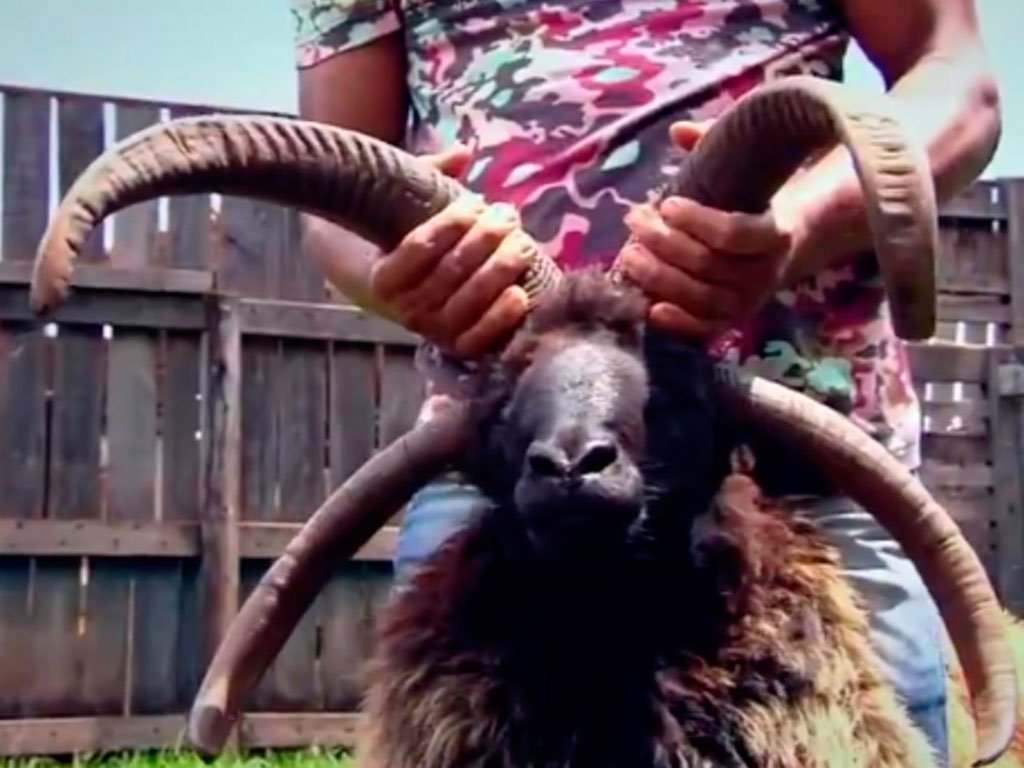 Carneiro de quatro chifres é um dos animais exóticos da fazenda em Quirinópolis — Foto: Reprodução/TV Anhanguera[/caption]