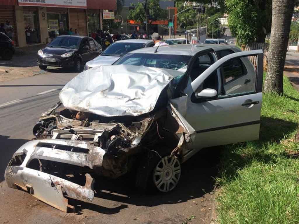 Carro teve a frente completamente destruída após atropelamento, em Goiânia, Goiás — Foto: Reprodução/TV Anhanguera[/caption]