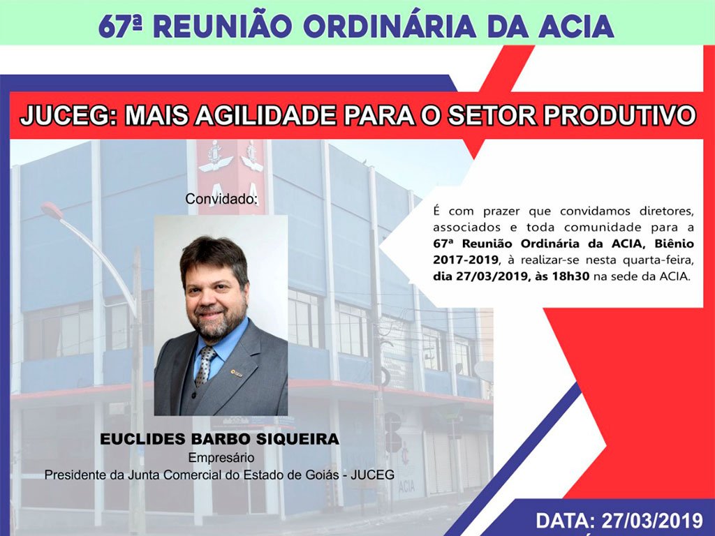 O empresário Euclides Barbo Siqueira é o mais novo presidente da Junta Comercial do Estado de Goiás (JUCEG) e o convidado da 67ª Reunião Ordinária da Acia , além também de prestigiar o presidente Anastácios Apóstolos Dagios, que no mês de abril encerra o mandato do Biênio 2017-2019[/caption]