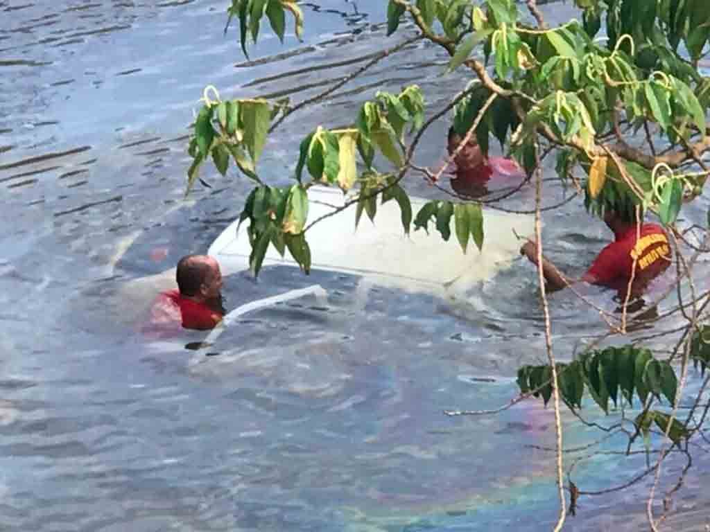 Mulher de 46 anos teve apenas ferimentos na boca. Bombeiros a levaram para o hospital e, depois, retiraram carro da água.