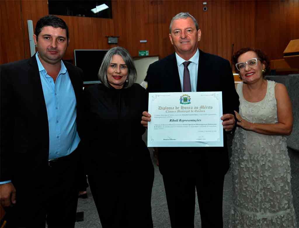 O Diretor Comercial da empresa Paulo Riboli, seu filho João Paulo e a Gerente de Eventos da Riboli Representações, Joniva Soares de Oliveira, a agraciada Queridinha, receberam a homenagem do Vereador Leandro Sena.