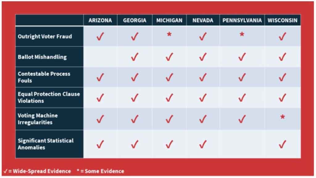 O relatório de 36 páginas “avalia a justiça e integridade da Eleição Presidencial de 2020 examinando seis dimensões de supostas irregularidades eleitorais em seis principais estados de batalha” e conclui que “padrões de irregularidades eleitorais … são tão consistentes nos seis estados de batalha que eles sugerem uma estratégia coordenada para, se não roubar a eleição, jogar estrategicamente o processo eleitoral de forma a … inclinar injustamente o campo de jogo em favor da chapa Biden-Harris”.