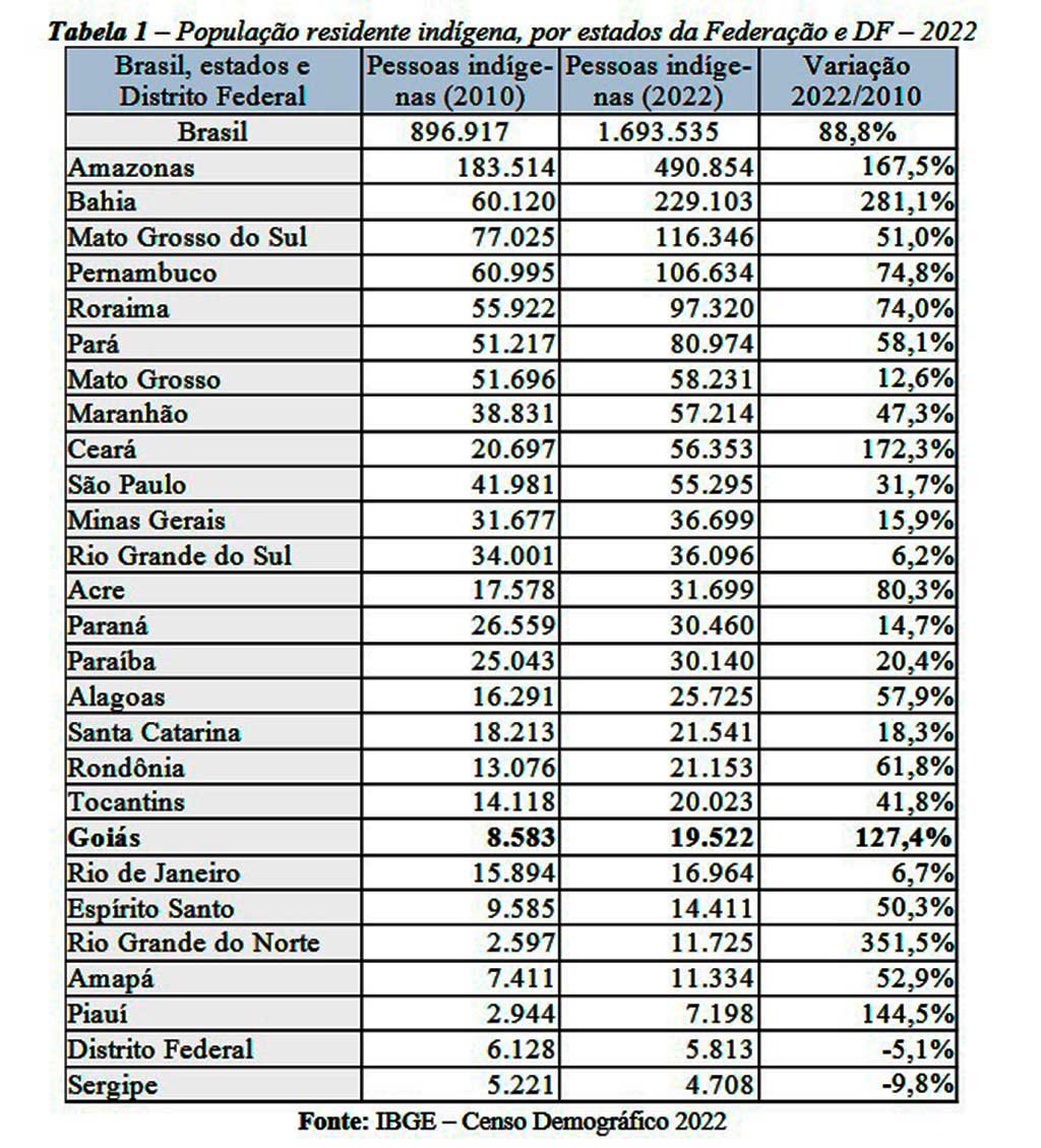 Na comparação com outros estados da Federação e o DF, Goiás tem a oitava menor população indígena, porém apresentou, em 2022, o sexto maior aumento percentual na comparação com 2010.
